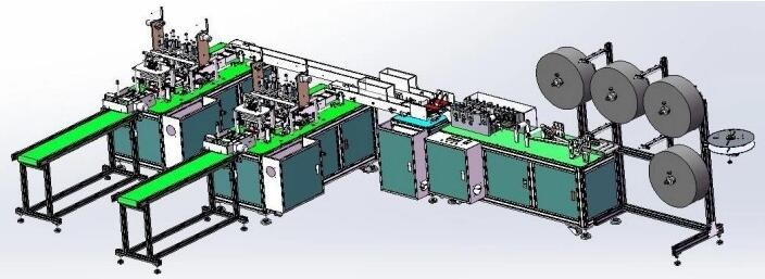 4. left ear tape with automatic feed length cutting, automatic ultrasonic welding; right ear tape with automatic feed length cutting, automatic ultrasonic welding Automatic folding; automatic ultrasonic folding welding; automatic roll cutting and blanking; automatic outflow of blanks; blanking masks flowing out through the assembly line;